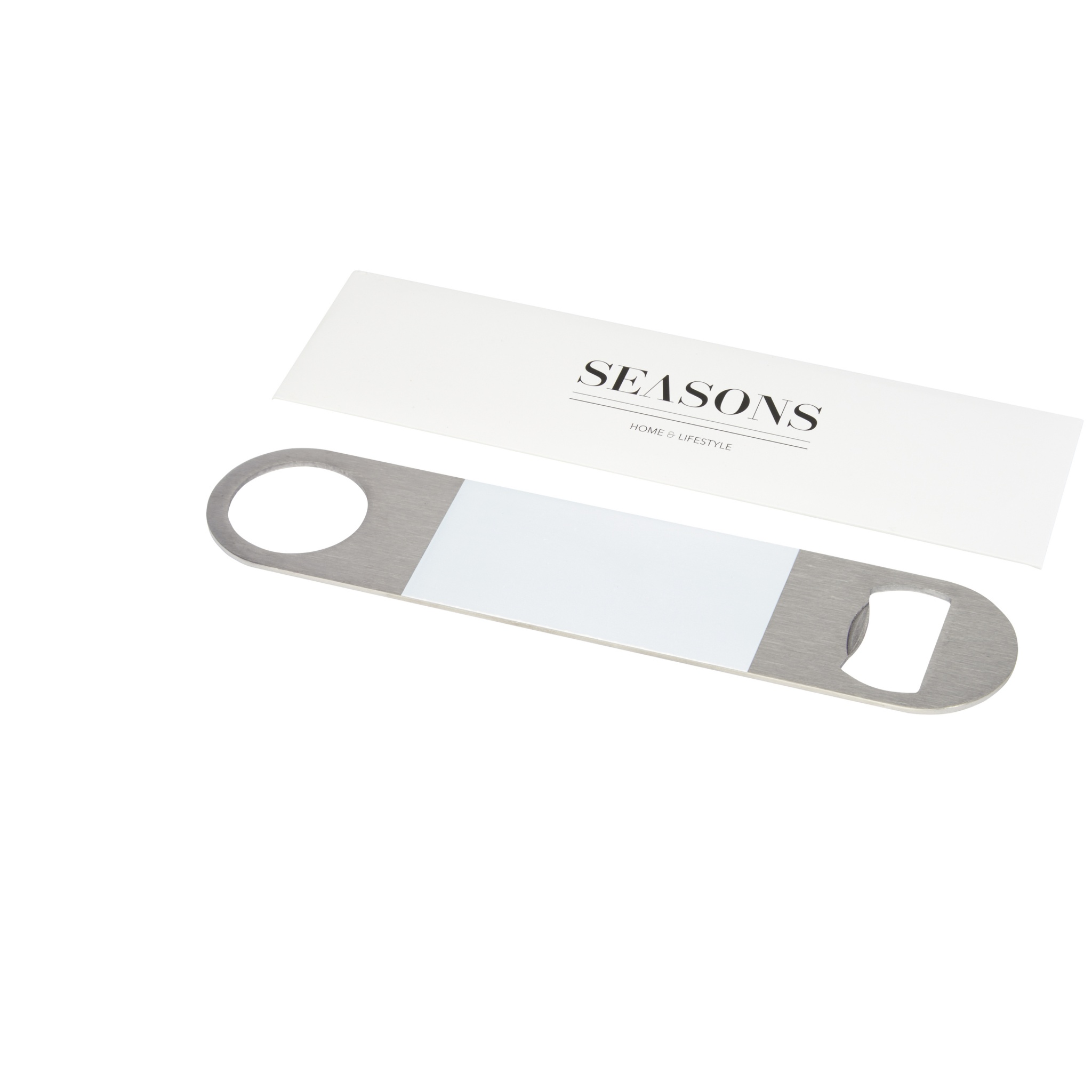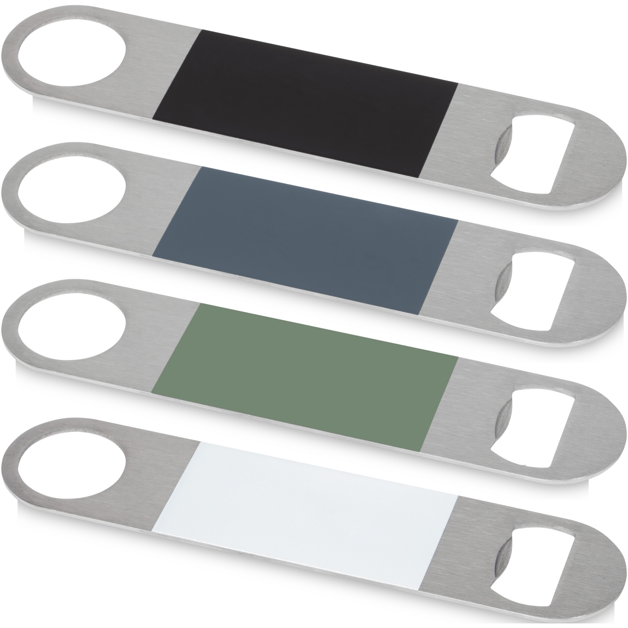 Открывалка для бутылок из нержавеющей стали с большой цветной областью в центре.