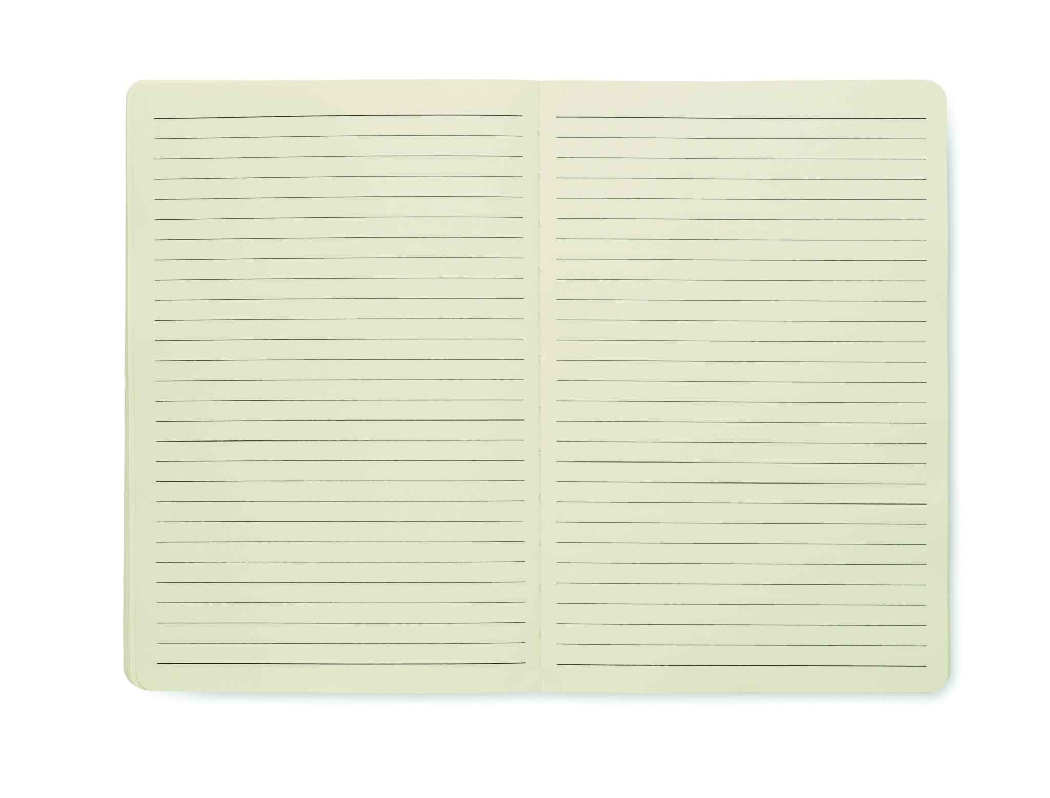 Папка формата А5 из RPET с деталями из искусственной кожи. Сменный блокнот формата А5 в твердой пробковой обложке и переплете. 128 линованных страниц из переработанной бумаги (64 листа). Держатель для ручки. 2 отделения для визиток и одно большое отделение. Эластичный ремешок с металлическими деталями.