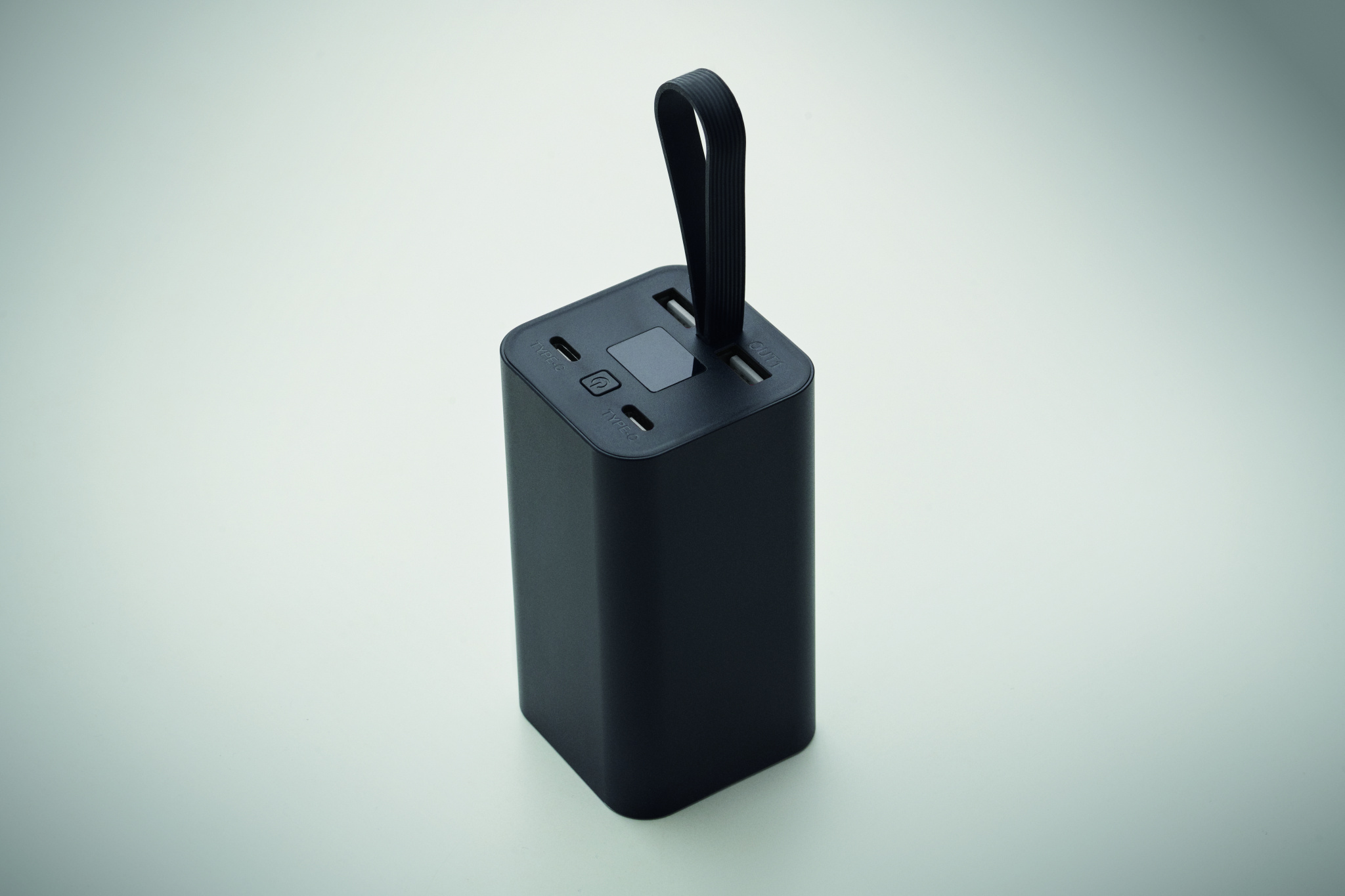 20.000 mAh power bank made of recycled aluminium with a digital power display and silicone hanger. Features two Type-C and two USB-A outputs with PD 65W fast charging.