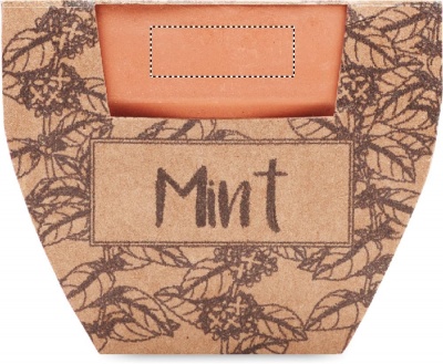 Небольшой глиняный терракотовый горшок с семенами мяты и землей для проращивания. Изготовлено в ЕС.
