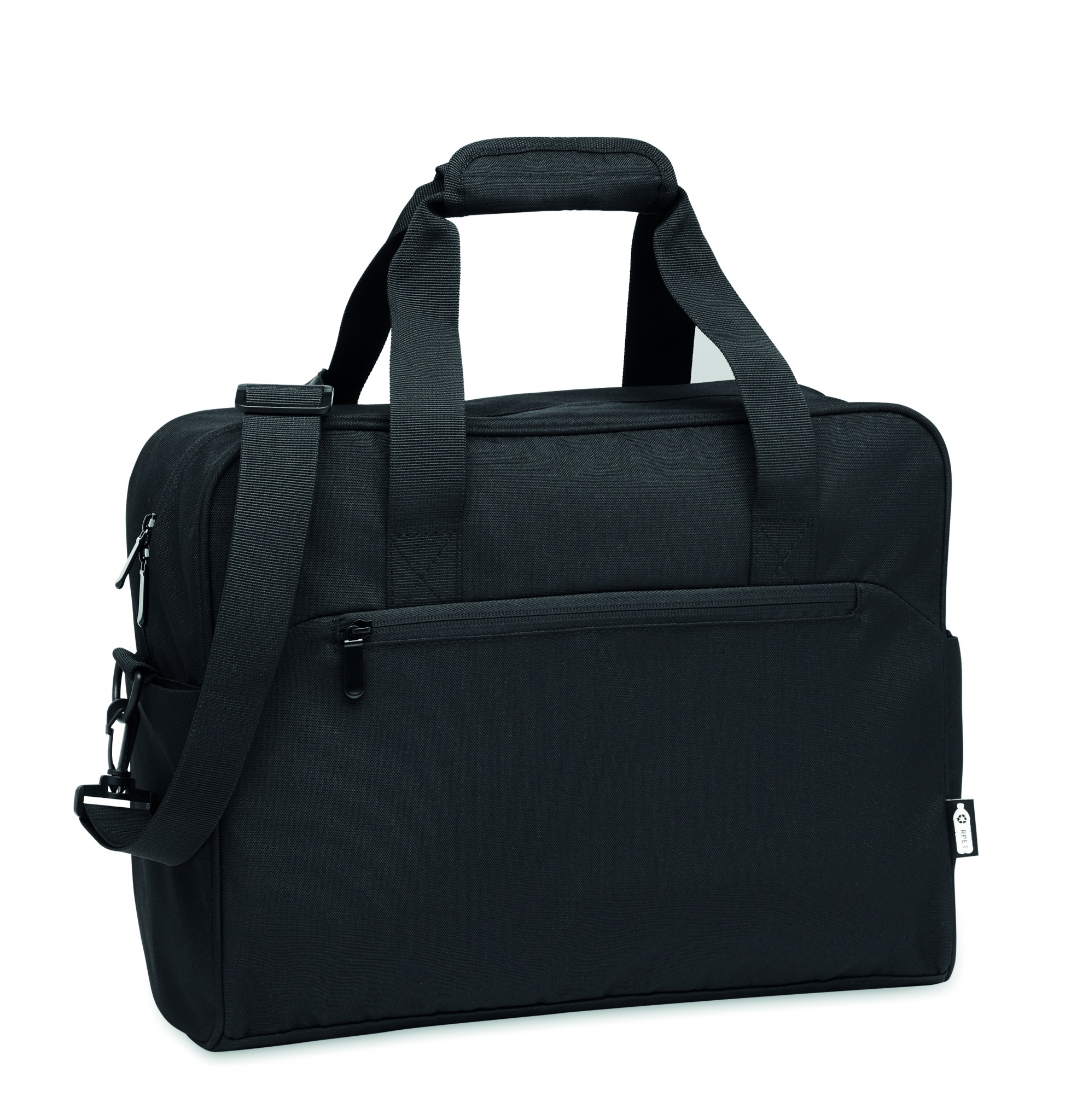 Дорожная сумка из материала 600D RPET с большим передним карманом на молнии и двумя маленькими боковыми карманами. Включает отделение для 15-дюймового ноутбука. Съемный регулируемый плечевой ремень с мягкой подкладкой. Держатель для чемодана на обратной стороне.