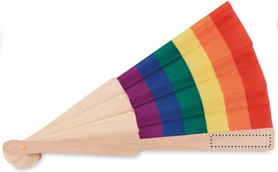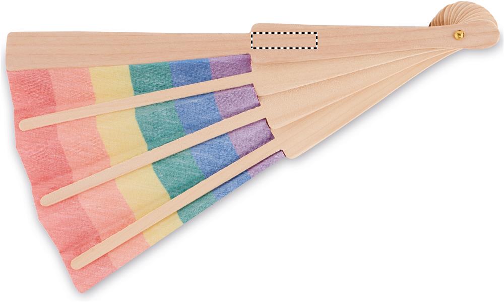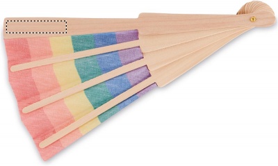 Ручной веер из дерева и полиэстера с радужным рисунком.