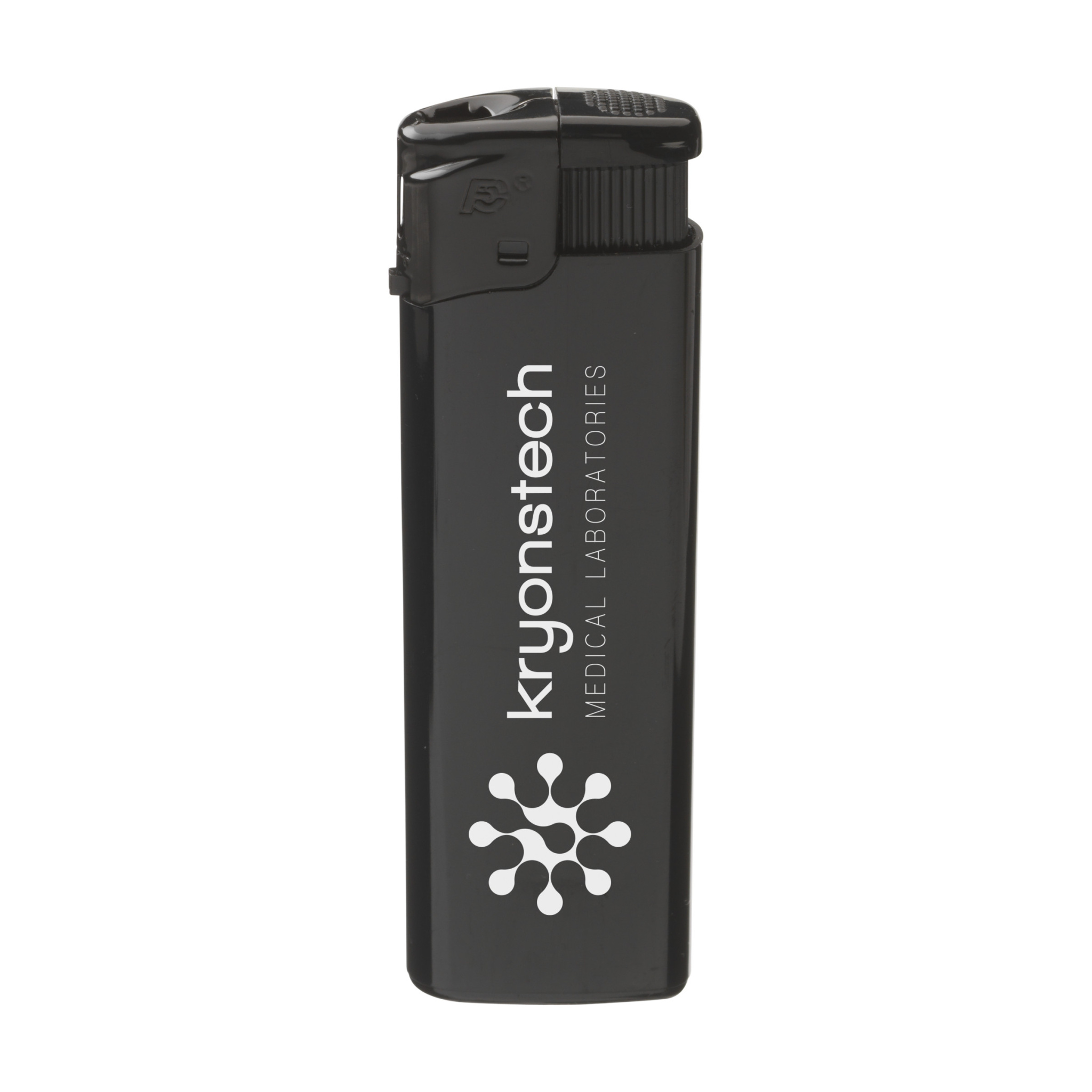 Электронная заправляемая зажигалка марки Flameclub® с регулируемым пламенем. Ветрозащищенная. Даже при сильном ветре турбопламя продолжает гореть. Оснащена замком от детей. Сертификация NEN: EN13869. Сертификация TÜV и сертификация ISO: ISO9994. Зажигалки поставляются только с печатью.