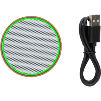 3W trådlös högtalare med hölje i FSC® 100% kork. Högtalarens batteri på 400 mAh ger en speltid på upp till 3 timmar. BT5.1 för smidig anslutning och klart ljud och en räckvidd upp till 10 meter.. Högtalaren har ett integrerat ljus när den är på. Med mikrofon för att besvara inkommande samtal. Levereras i FSC mix FSC® förpackning. Laddningskabel i RCS certifierad TPE medföljer. Produkt och accessoarer är 100% PVC-fria.