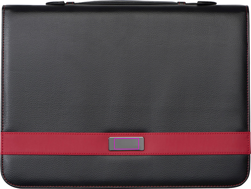 A4 skrivfodral med finaste Bonded Leather (läderfibertyg), olika gummiöglor och glidfickor, ringpärminsats, skrivblock (60 sidor), hållare för surfplatta/smartphone, mobilficka, bärhandtag och dragkedja. Din logotyp kommer att lasergraveras på utsidan av metallplattan.