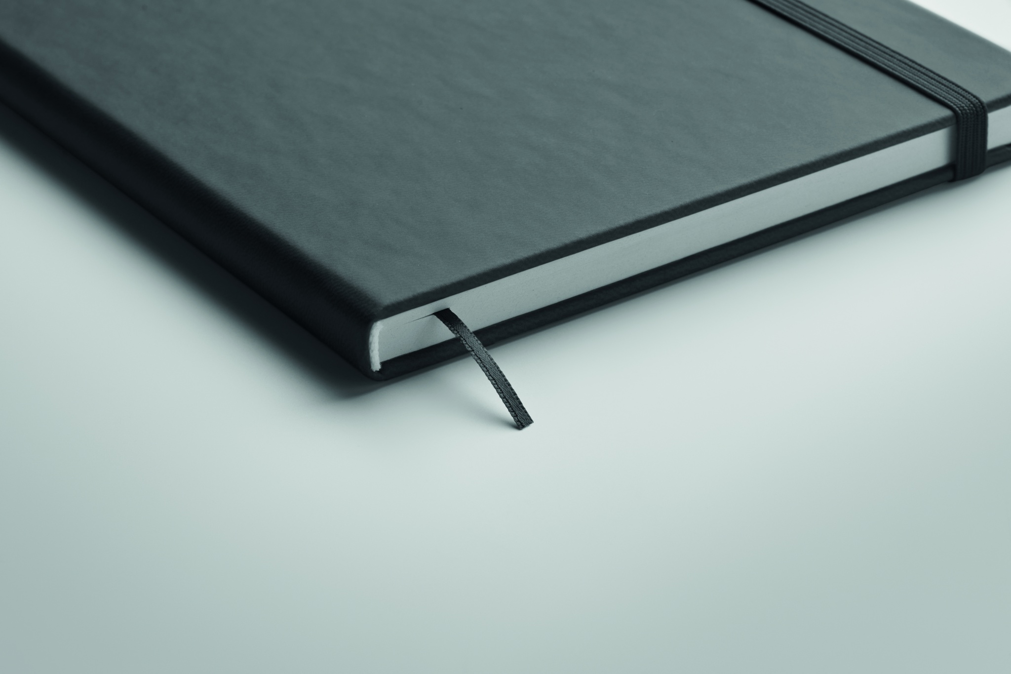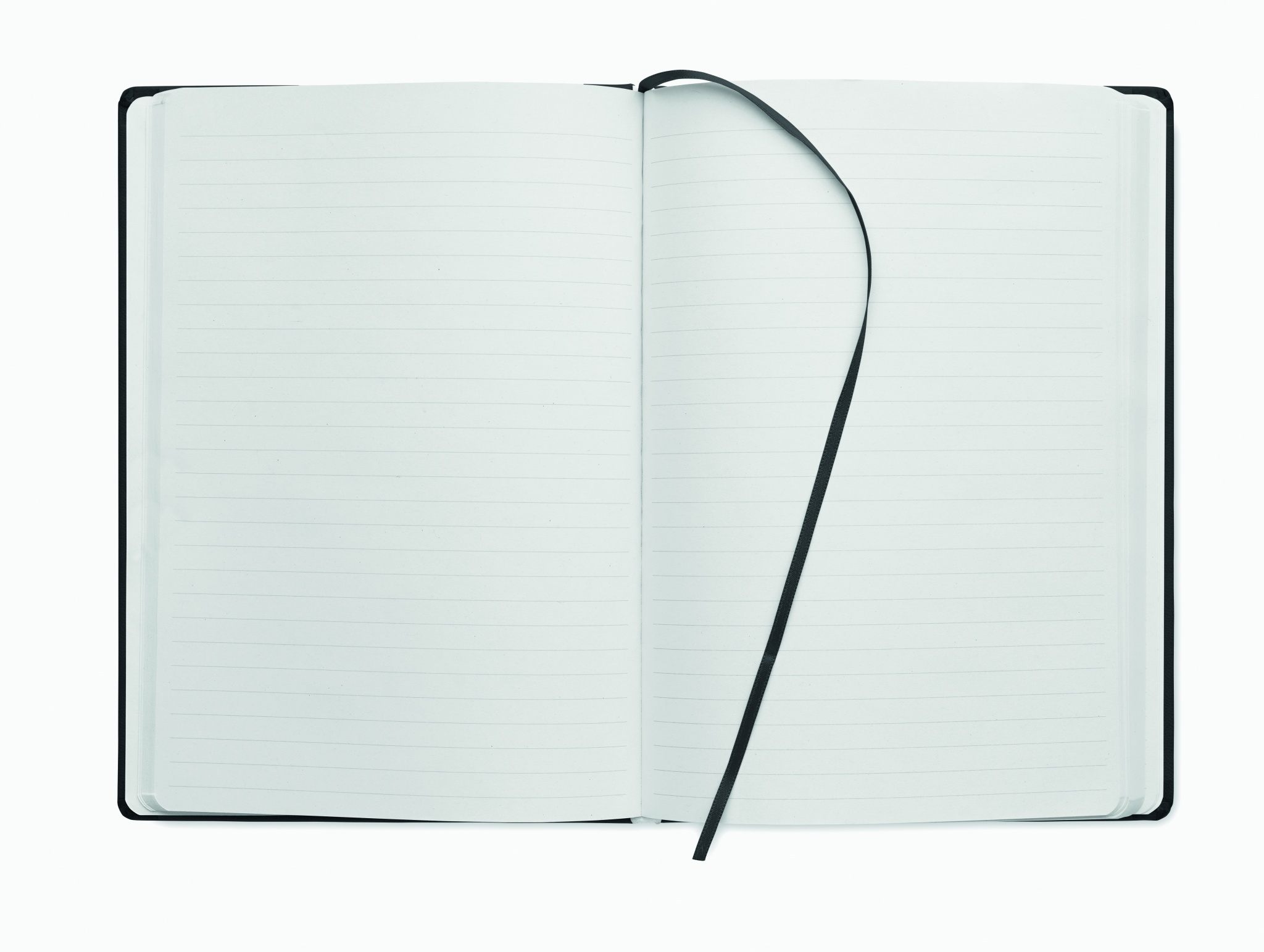 A5-anteckningsbok med hårda PU-pärmar. Inbunden med 200st linjerade sidor (100 ark) av återvunnet papper (80 gsm). Matchande elastiskt band för stängning och sidmarkeringsband. Tillverkad i EU.