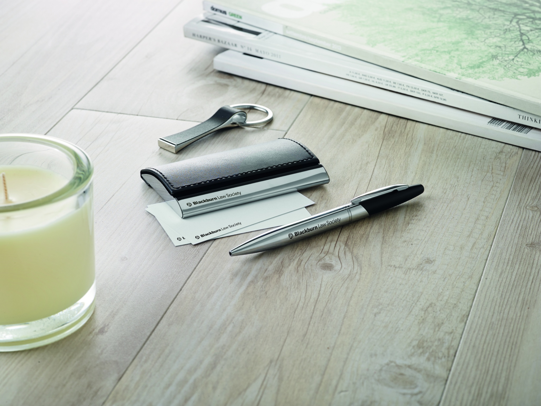 Presentset med kulspetspenna i metall med vridmekanism, nyckelring i PU/ och visitkorthållare. Exklusiv presentask. Pennan har svart bläck.