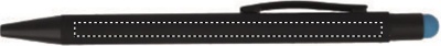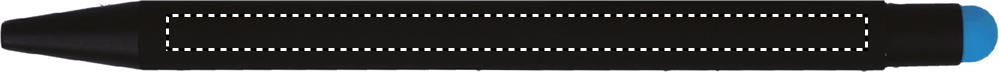 Aluminium penna med gummerad lackad yta och tryck funktion. Skaftet har under den svarta färgen motsvarande färg som touch toppen vilket gör att märkningen vid lasergravering får motsvarande färg. Blått bläck i patronen.