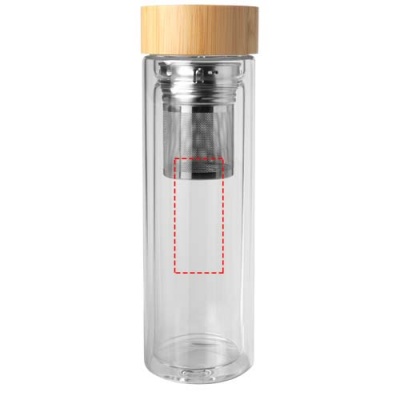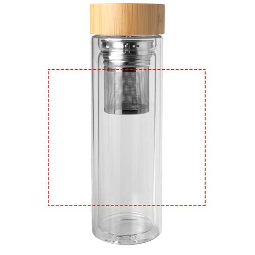 Vattenflaska i borosilikatglas med dubbla väggar med en teinfusionsanordning och lock i bambu. Bambun som används kommer från hållbara, miljömässigt och socialt ansvarsfulla källor. Volymkapacitet: 400 ml. Levereras i en förpackning av återvunnen kartong.