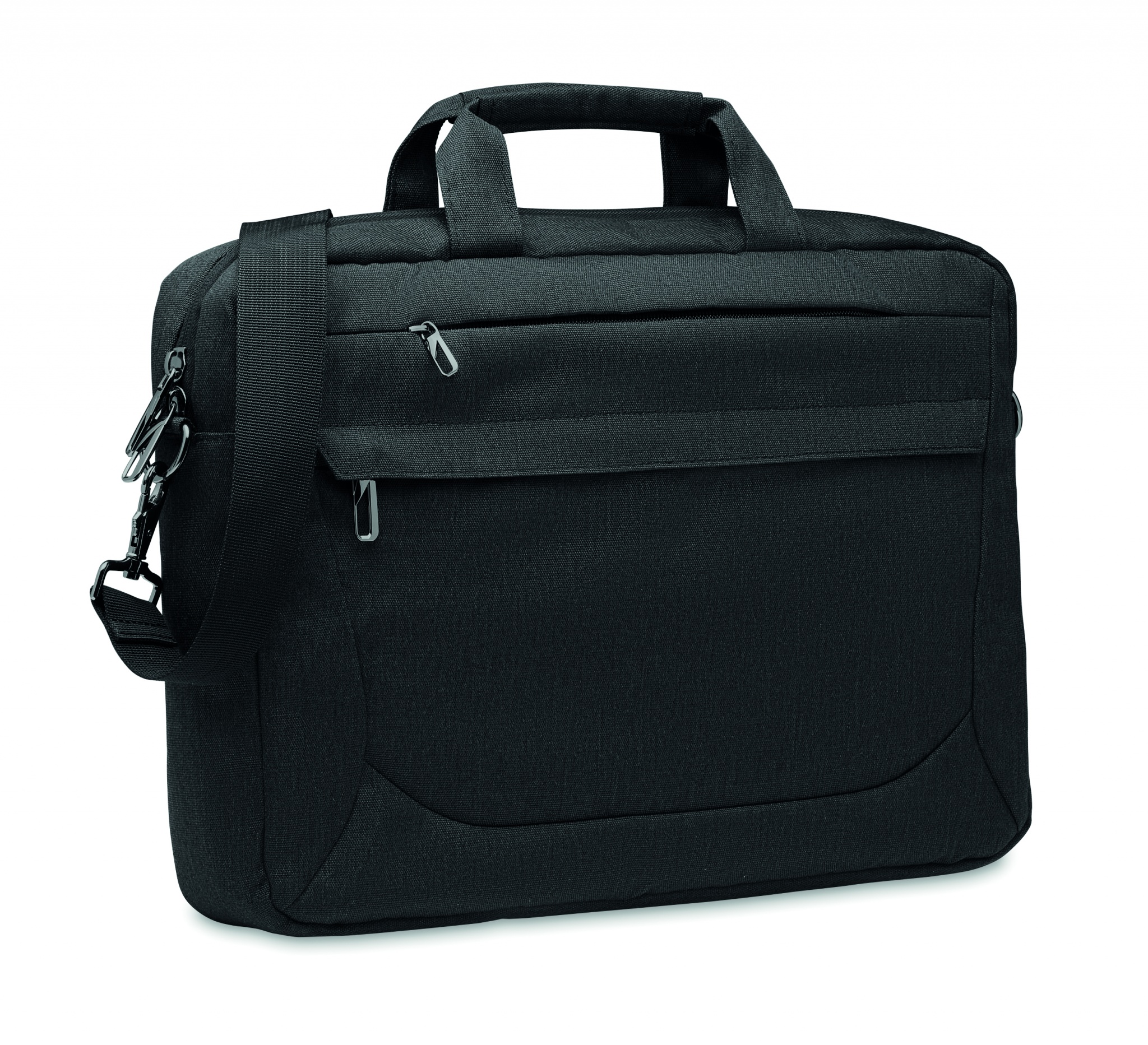 Dataväska för bärbar dator 15 tum i 600D RPET polyester. 2 inre huvudfack och stor frontficka med dragkedja. Den har en liten ficka med dragkedja. Avtagbara och justerbara axelremmar. Trolleyhållare på baksidan.