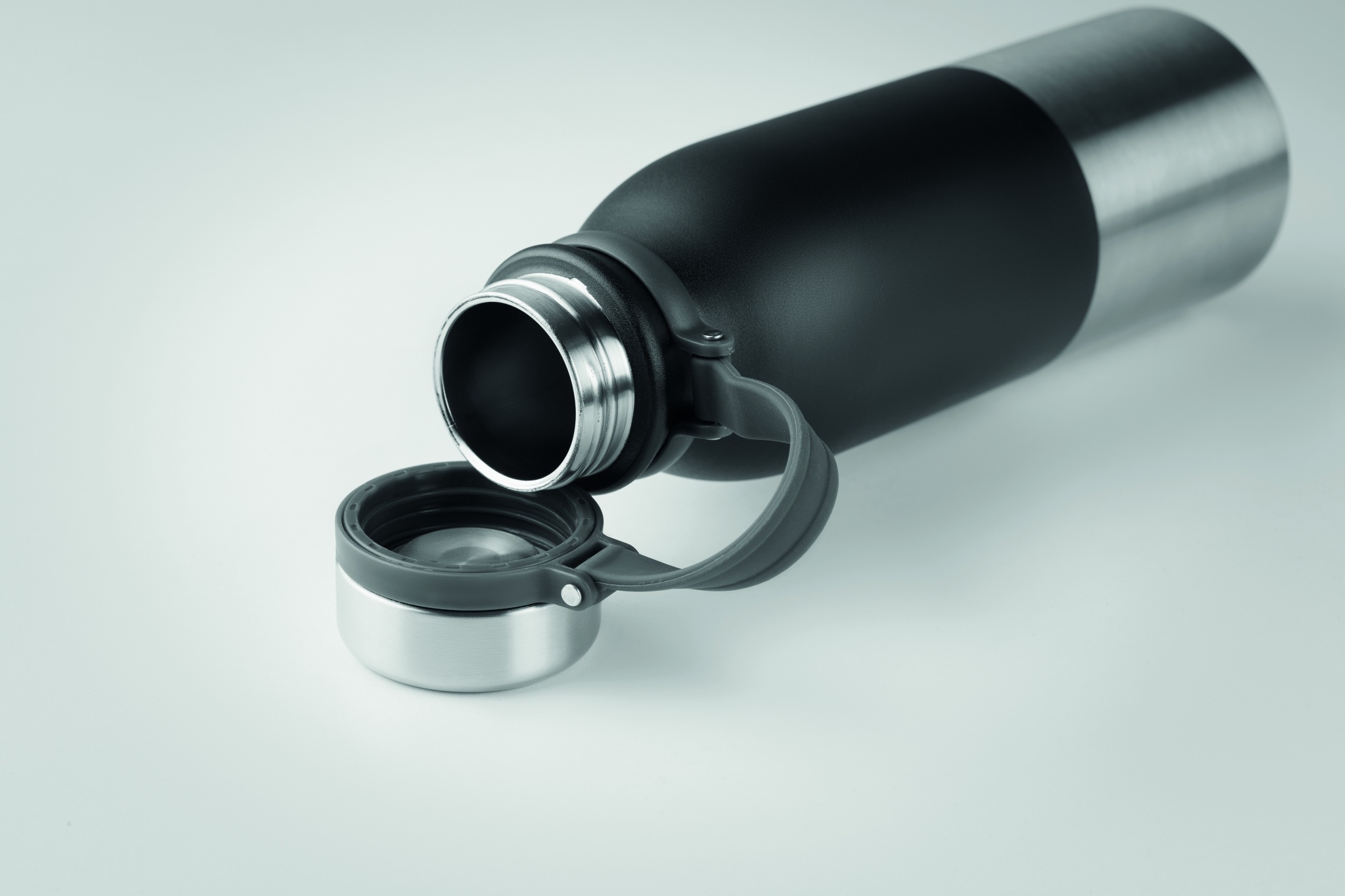 Vattenflaska/termos med dubbelväggad i rostfritt stål med silikon runt om för ett bra grepp. Termosen är läckagefri. Kapacitet: 600 ml. Läckagefritt.