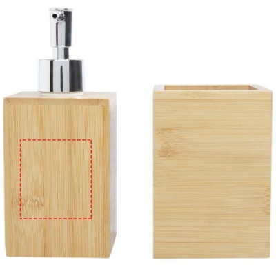 Badrumsset med tre delar av bambu i modern design med en tvålkopp med en sil (11 x 8,2 x 2,4 cm), en tvål- eller lotiondispenser (7,1 x 7,2 x 16,8 cm) och en tandborsthållare (8 x 8 x 11,5 cm). Den använda bambun kommer från och produceras enligt hållbara standarder.