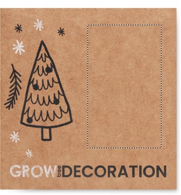 Julpynt i form av ett träd med jutesnöre och granfrön. Presenteras i kraftkuvert.