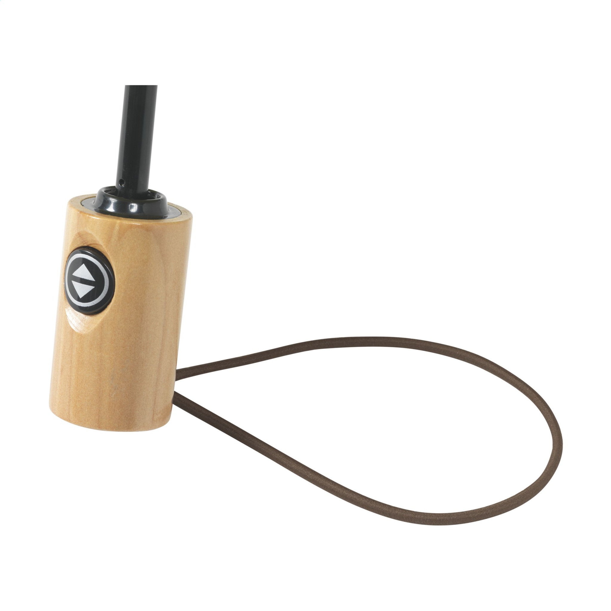 WoW! Fällbart paraply med automatisk öppnings- och stängningsmekanism. Levereras med ett RPET 190T pongee polyesteröverdrag. Detta paraply har också ett skaft av rostfritt stål och trähandtag i ram, elastisk bärögla och kardborrestängning. Längd nedfälld: 28 cm. RCS-certifierad. Totalt återvunnet material: 16%.