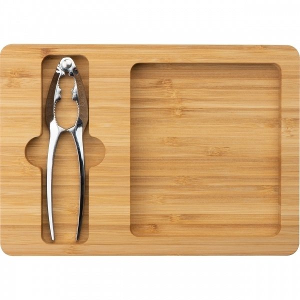 Vacker bambuskål med nötknäppare i metall. Ge ditt logotypmeddelande en särskilt välsmakande miljö med den här artikeln. Vi trycker din logotyp till bambuskålen genom lasergravering.