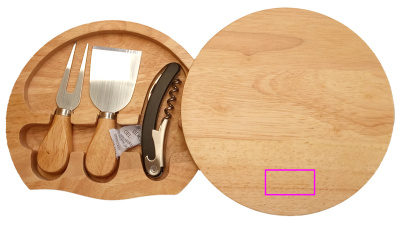 Ostbräda gjord av trä (gummiträ), innehåller en ostkniv, en ostgaffel och en servitörskniv. Vi graverar din logotyp på tavlan.