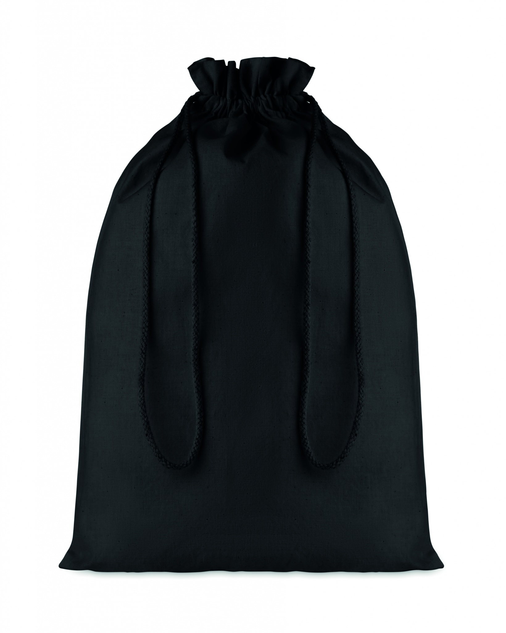 En stor 105 g/m² bomullsgåvopåse med dragsko, mått 30 x 47 cm, i svart färg, tillgänglig med din egen design på www.logo.ee. Beställ denna och andra presenter och produkter med personligt tryck online för ditt företag!