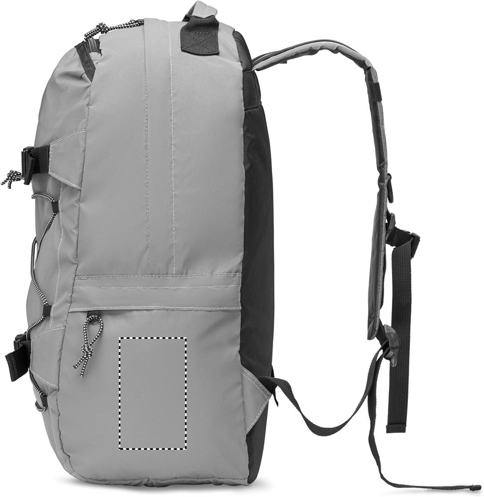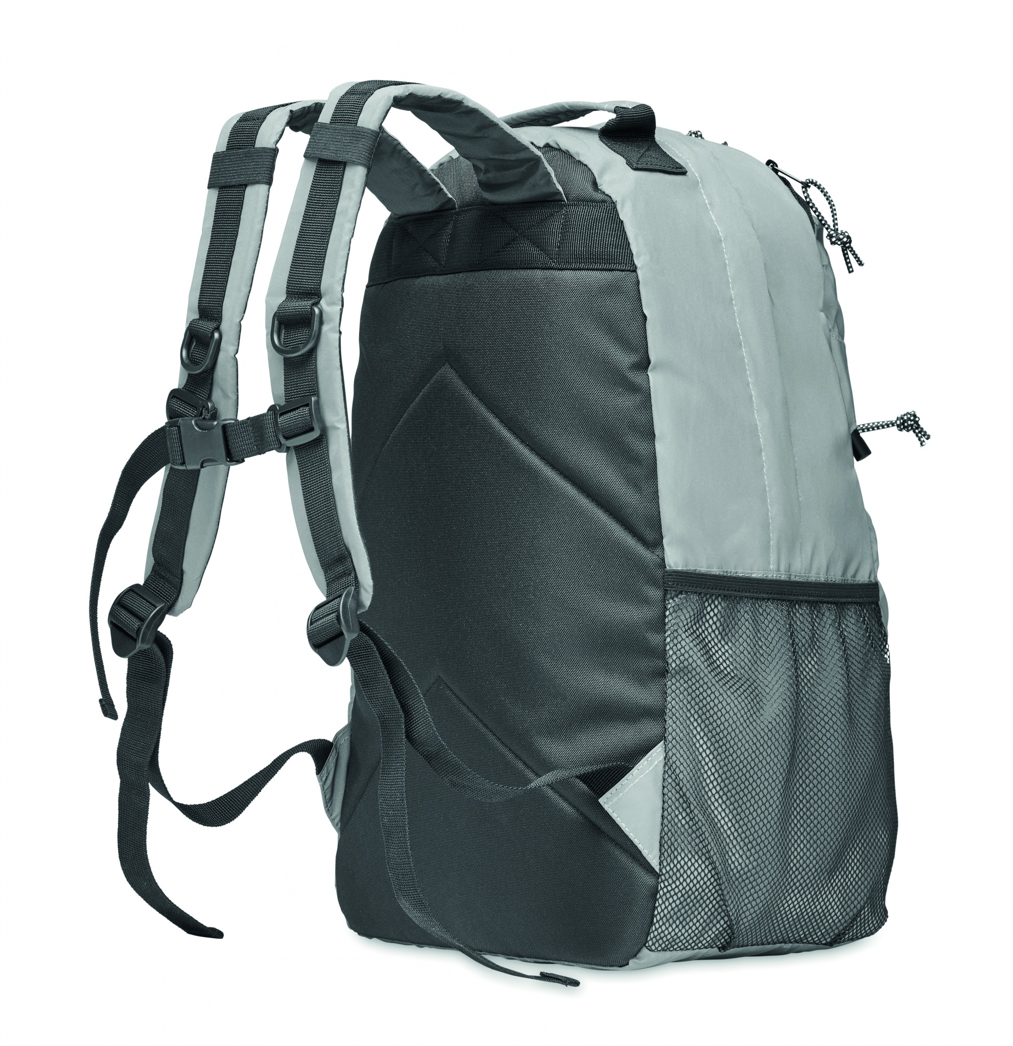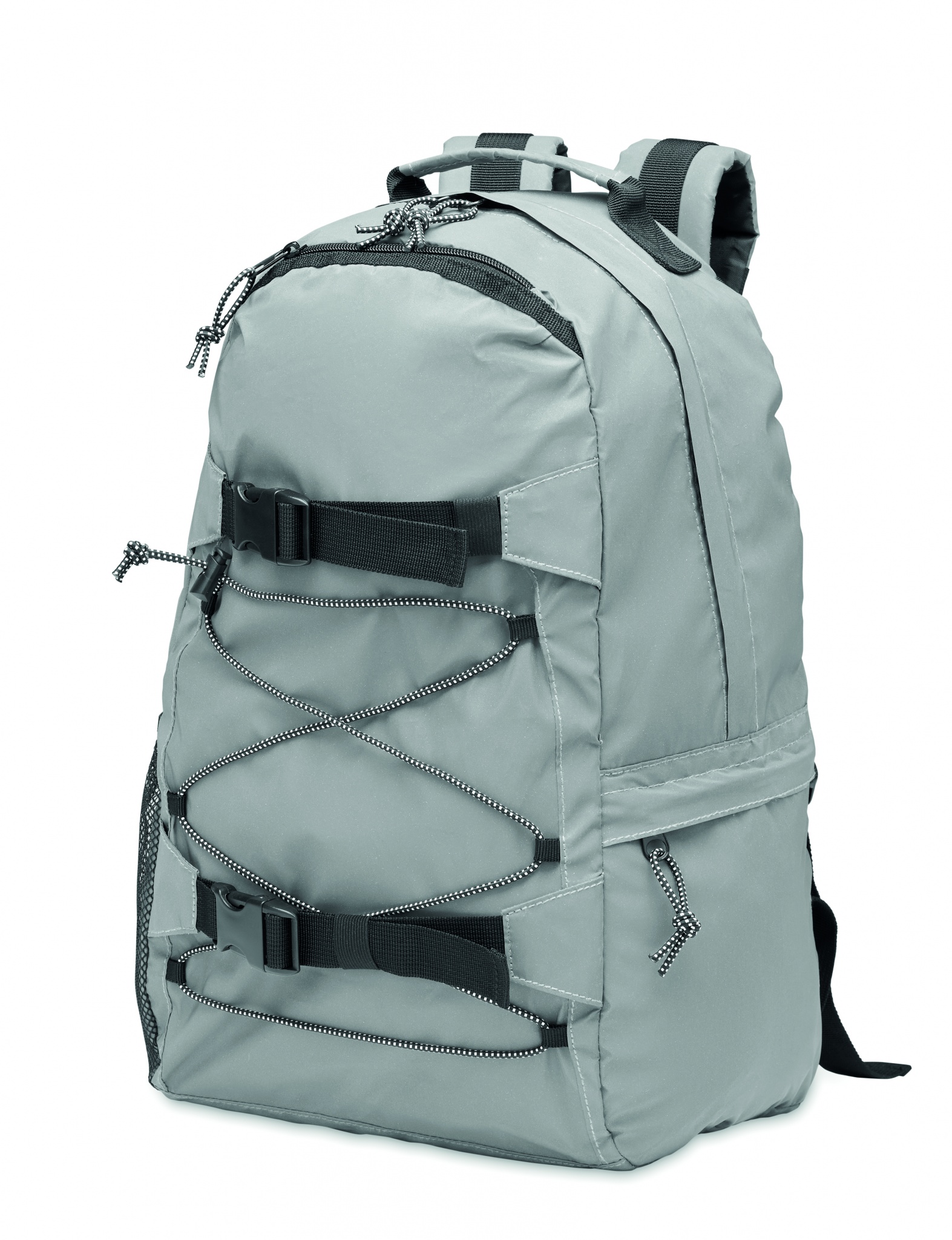 Ryggsäck i högreflekterande 190T polyester med snöre på framsidan. Vadderad rygg, remmar och botten. Den har ett fack för 15'' bärbar dator. En nätficka på ena sidan och en ficka med dragkedja på den andra sidan.