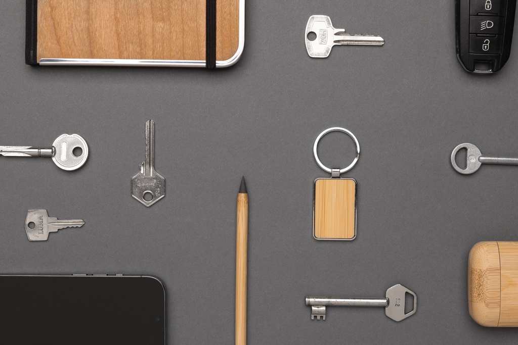 Logotrade kampanjprodukter bild: Rektangulär nyckelring i bambu & RCS återvunnen zinklegering