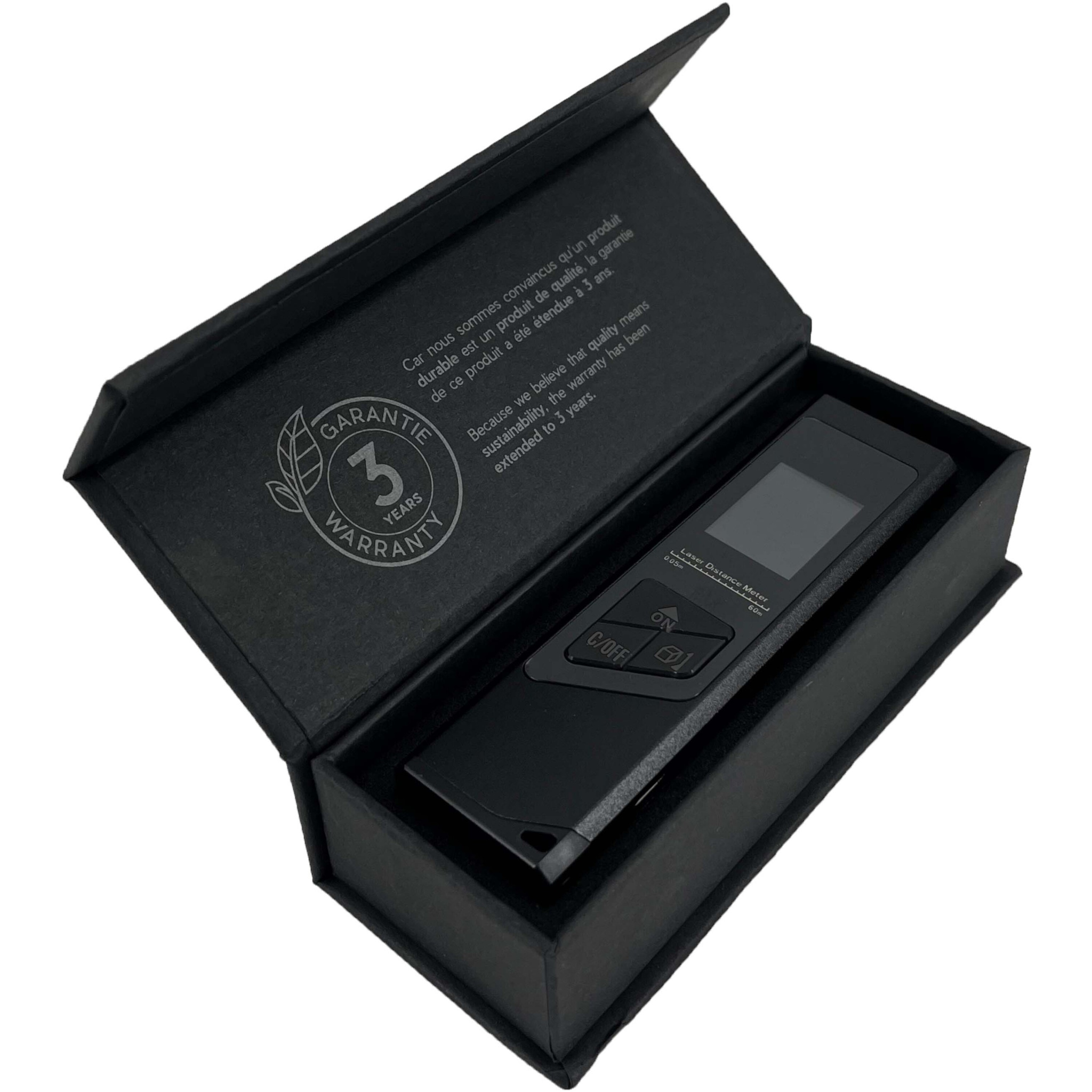 Med minilaseravståndsmätaren kan du på ett enklare, snabbare och mer exakt sätt att mäta yta, volym och den har dessutom en Pythagoras-funktion. Med sin laserprecisionsteknik och mätningsläge i realtid ger den tillförlitliga mätningar på upp till 40 meter. Avståndsmätaren använder ett energibesparande 200 mAh litiumjonbatteri som strömförsörjning och kan mäta avstånd 2 000 gånger efter fulladdning. Den har en bakgrundsbelyst skärm för enkel visning även på mörka platser. Storlek: 9 x 2,4 x 1,1 cm. Förpackad i en presentförpackning av återvunnet papper (10,2 x 4,2 x 3 cm) med magnetstängning. Inkluderar 3 års garanti.