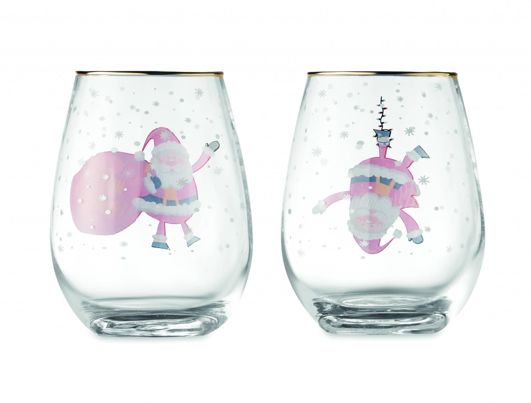 Set med 2 julglas med gyllene kant. Presenteras i en presentförpackning. Kapacitet: 330 ml.