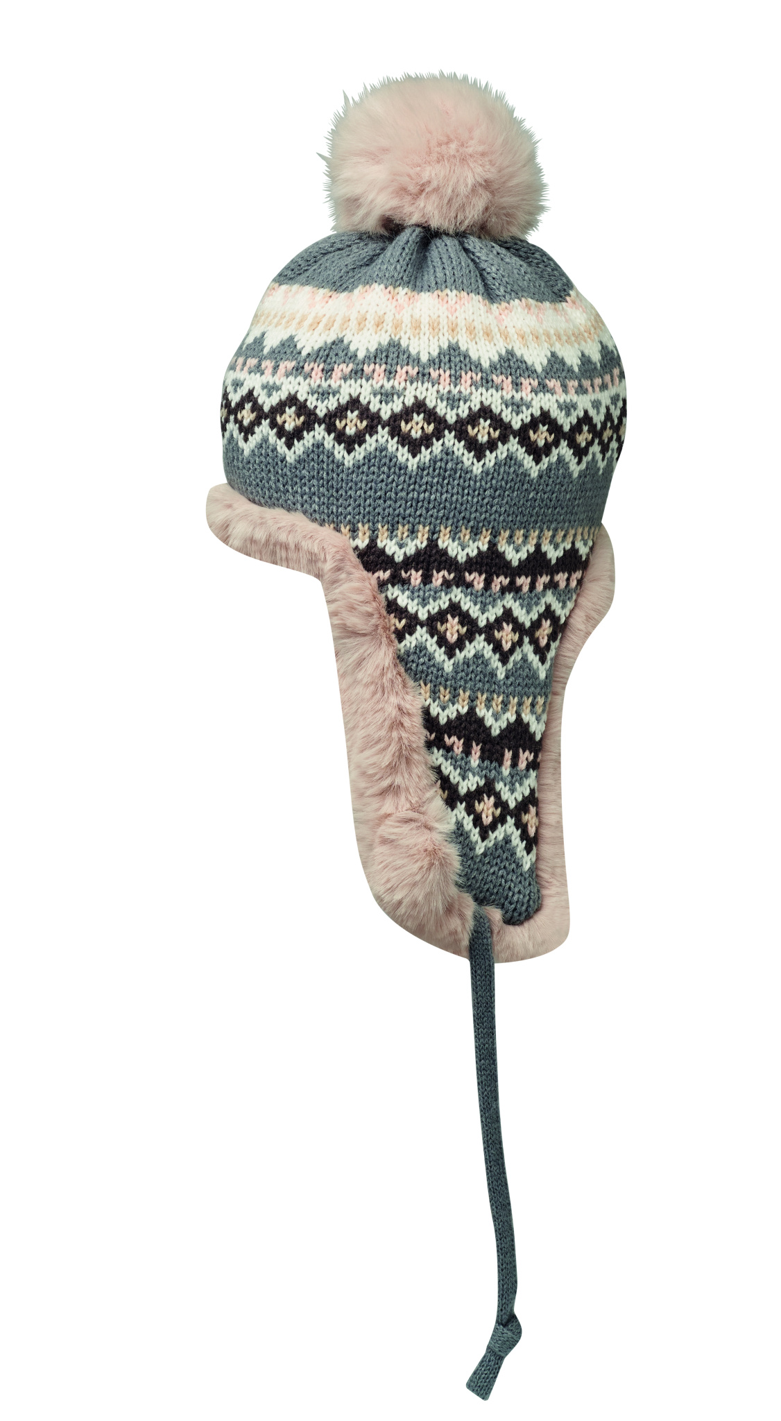 Stickad mössa med öronlappar och tofs i akrylfiber med polyester- och fleecefoder. Inklusive etikett för tryckyta på ena sidan. Storlek vuxen (58cm).