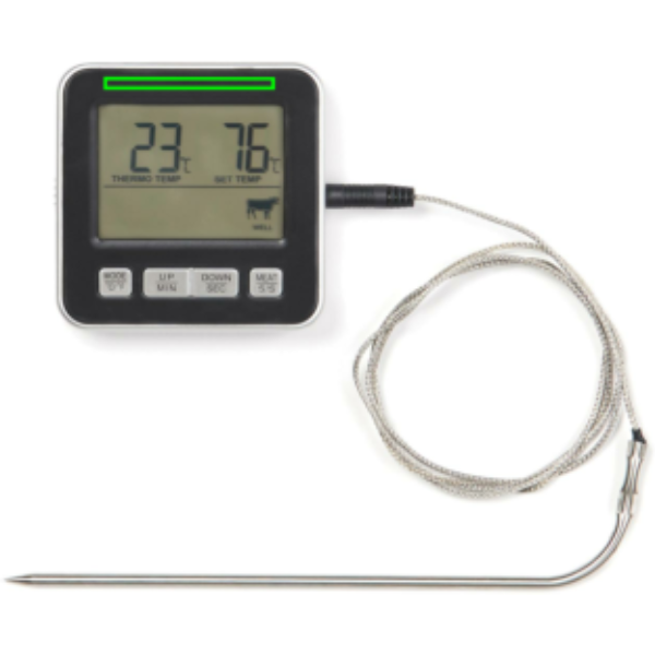 Servera den perfekta måltiden med den här praktiska matlagningstermometern. Vare sig du steker en saftig rostbiff eller bakar en speciell tårta kommer den här termometern med många funktioner att vara ovärderlig i köket, oavsett om du lagar mat i ugnen, grillar eller bakar. Timer-funktion och larmfunktion ger dig full kontroll. Termometern visar även Celsius och Farenheit så att du kan anpassa den efter dina behov. Inget kök är komplett utan en.