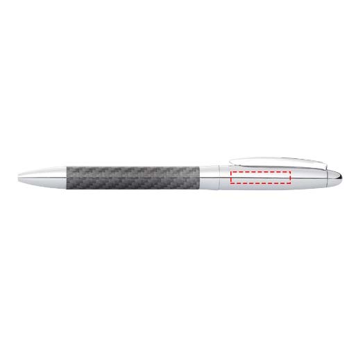 Kulspetspenna med vridmekanism i klassisk design med glänsande överdel och underdel med kolfiberdetaljer. Presentförpackning i form av en cylinder.