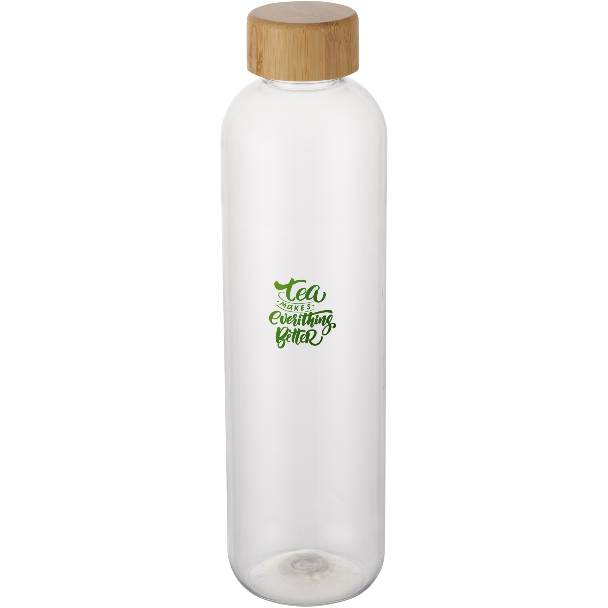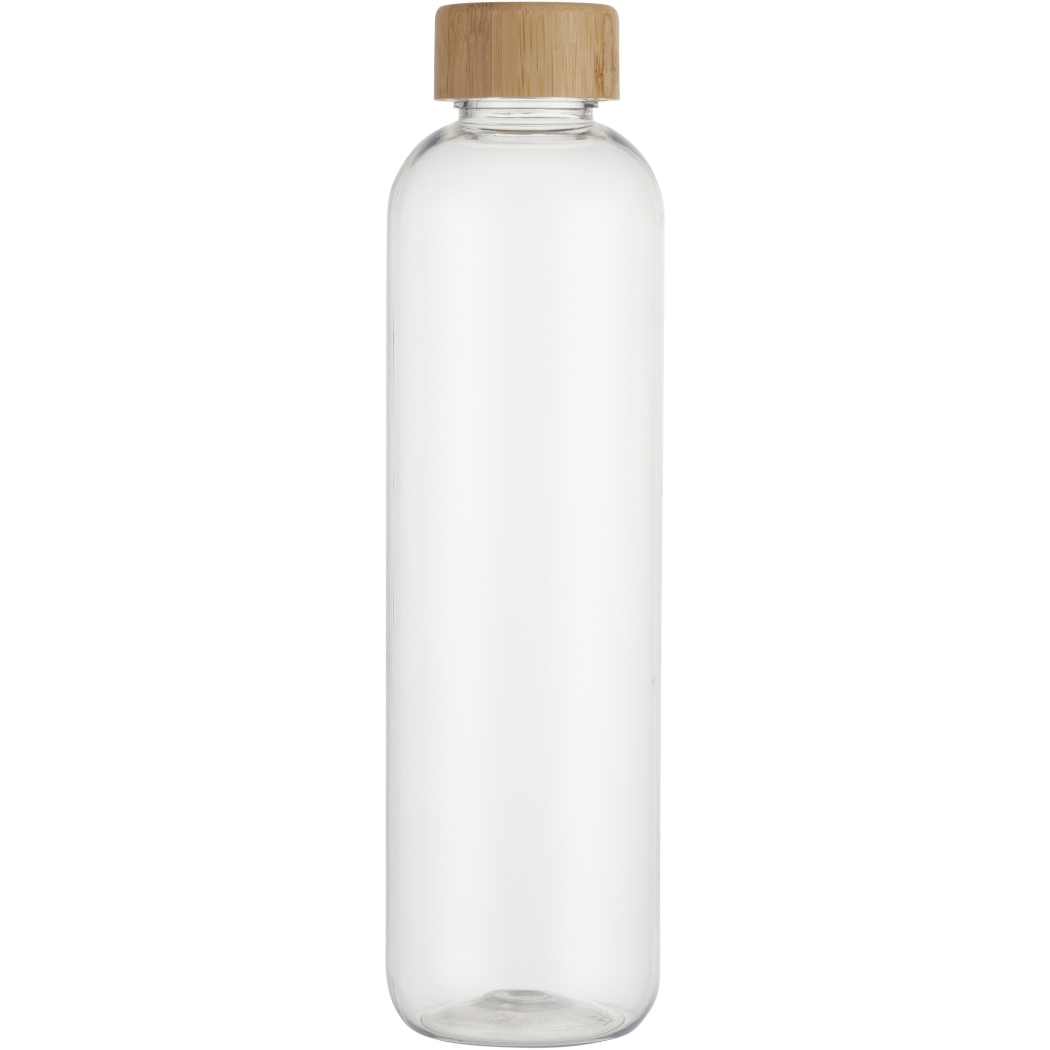 Vattenflaska tillverkad av återvunnen plast, med ett snyggt lock av bambu. Flaskan har enkelvägg, är BPA-fri, testad och godkänd enligt tysk lagstiftning om livsmedelssäkerhet (LFGB). Testad och godkänd för ftalat-innehåll enligt REACH-förordningen. Bambun kommer från hållbara, miljömässigt och socialt ansvarsfulla källor. Volymkapacitet 950 ml. Handdisk rekommenderas. Levereras i en presentförpackning av återvunnen kartong.